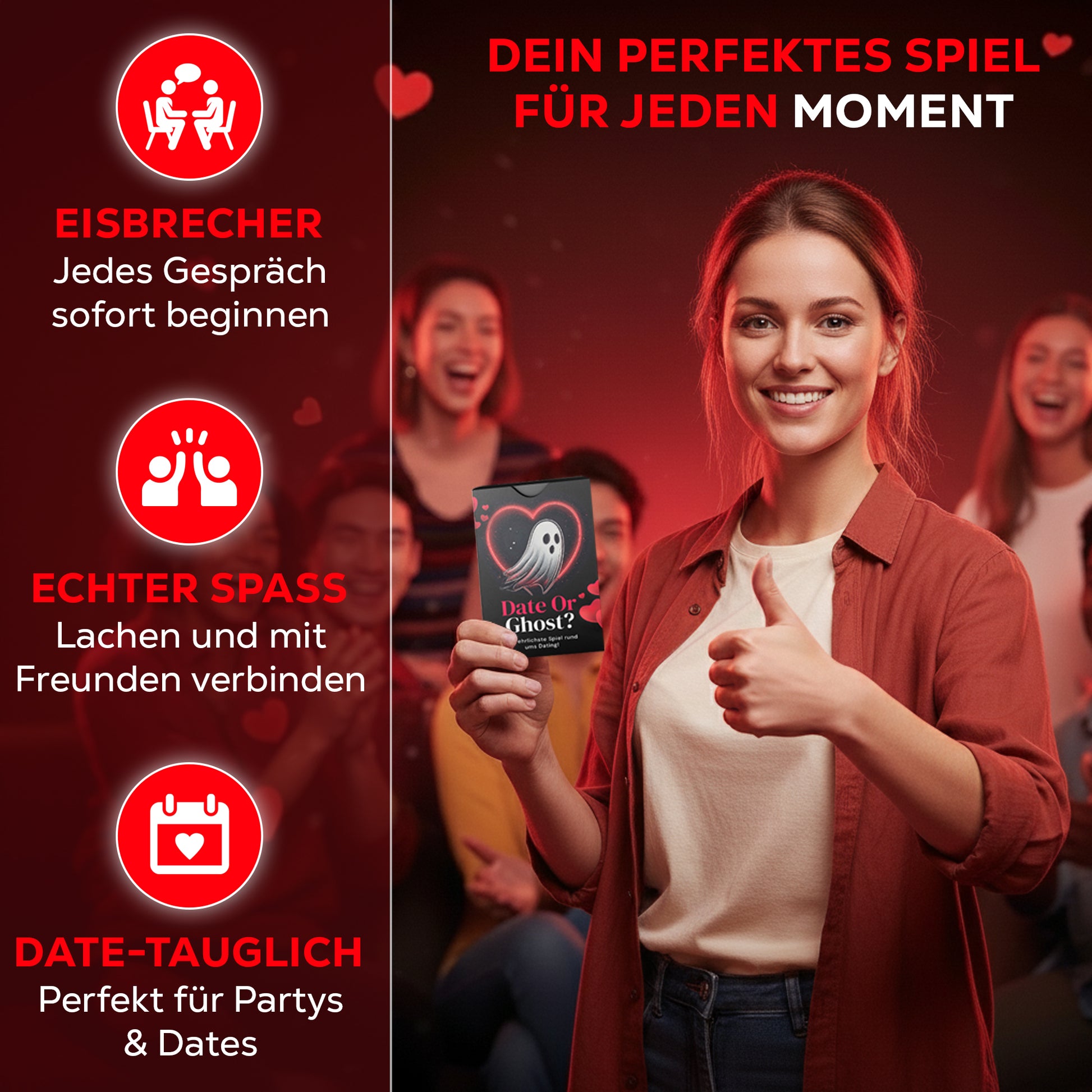 Date or Ghost kannst du so oft spielen, wie du willst – es wird nie langweilig! Weil jede Runde mit neuen Leuten, neuen Meinungen und frischen Diskussionen anders verläuft, ist das Spiel immer wieder spannend und sorgt für Abwechslung.