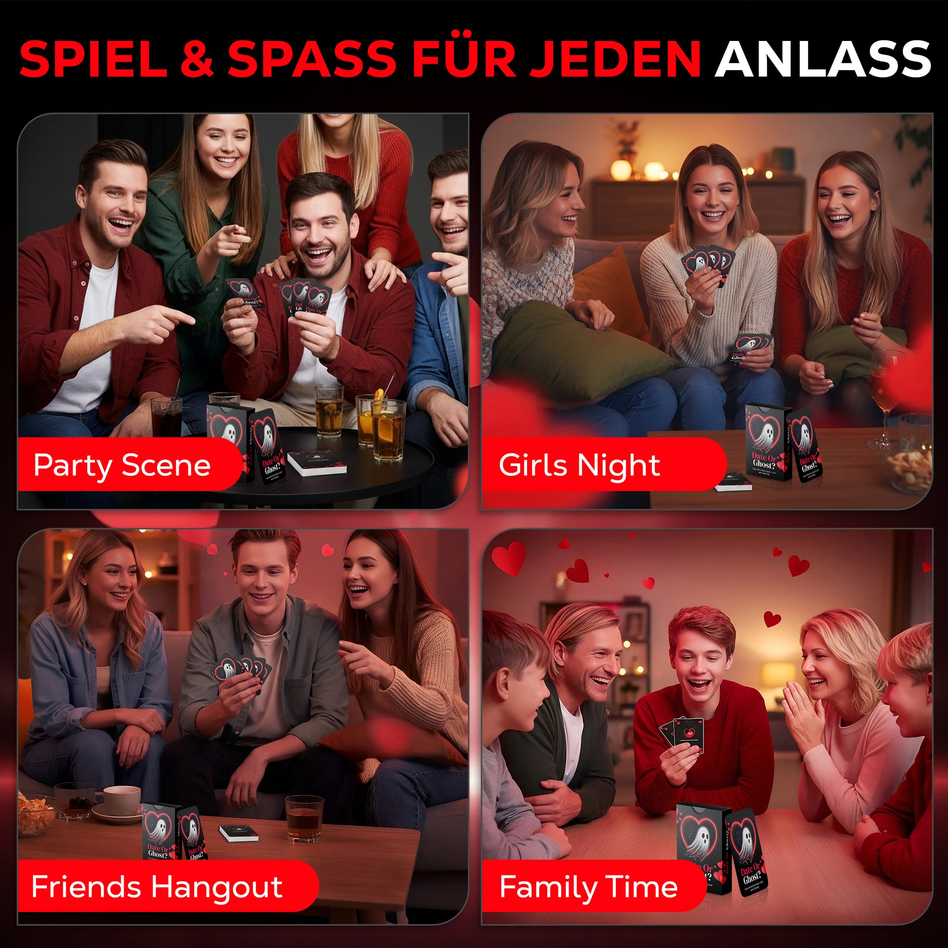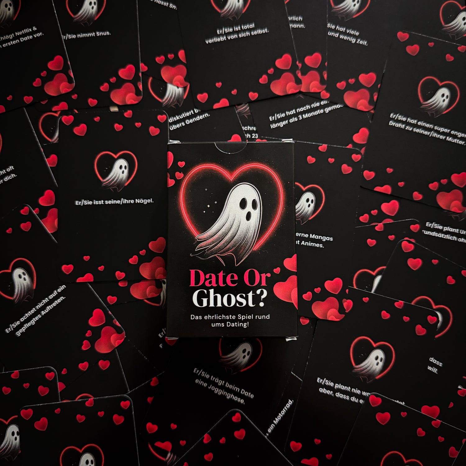 Du kannst Date or Ghost praktisch überall spielen! Egal ob im Flugzeug, im Zug, beim Spieleabend mit Freunden, auf Partys, beim ersten Date oder einfach gemütlich im Wohnzimmer – das Spiel ist leicht mitzunehmen und braucht nicht viel Platz. Es eignet sich perfekt für unterwegs oder als Highlight bei jeder Runde mit Freunden.